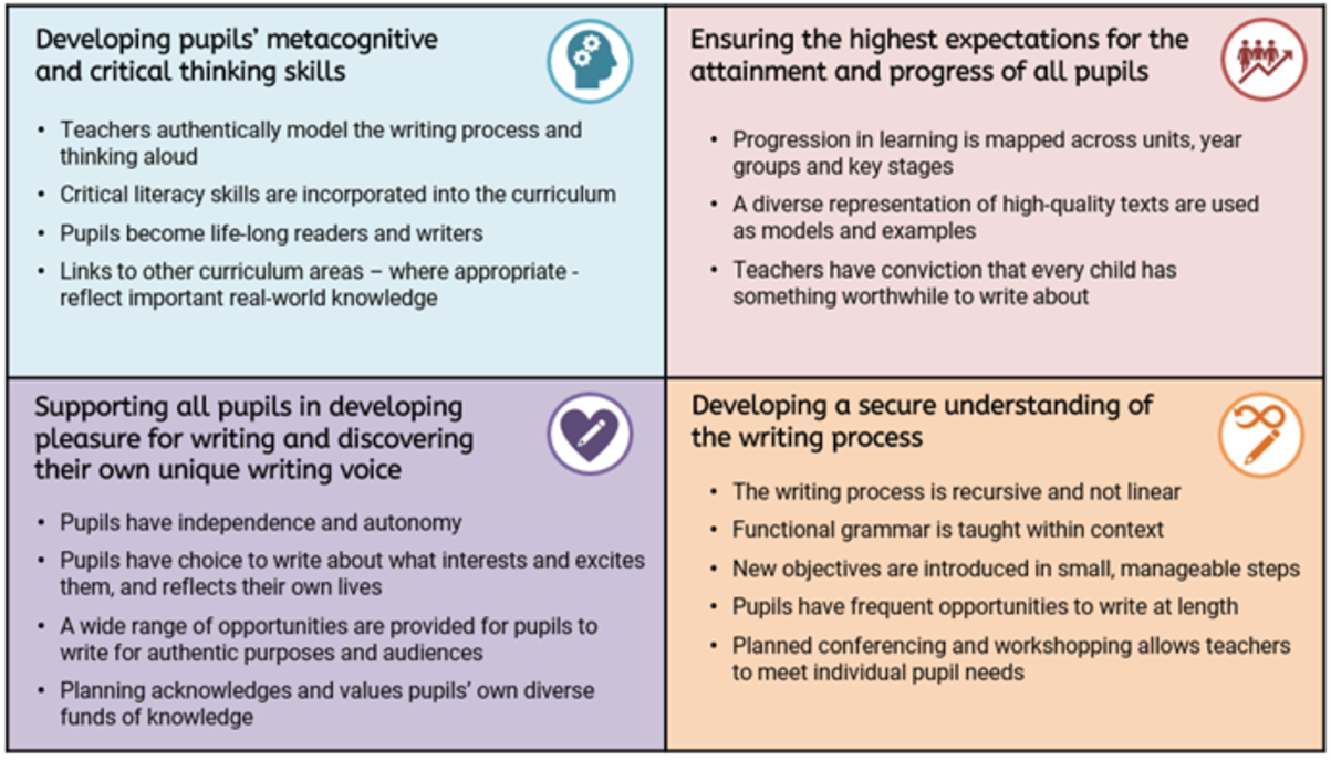 Writing is a powerful means of communication that builds on the spoken word. This vital skill is necessary to allow pupils to function, engage, and contribute within our society. Our aims in teaching writing are to equip pupils with a strong command of spoken and written language and to develop a love of literature.
